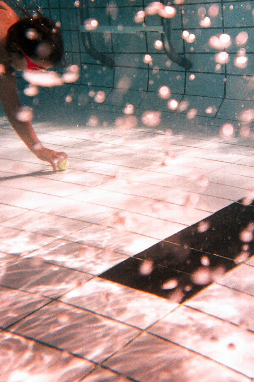 | #08 Réception d’un saut du plongeoir, avec mes bulles au premier plan |