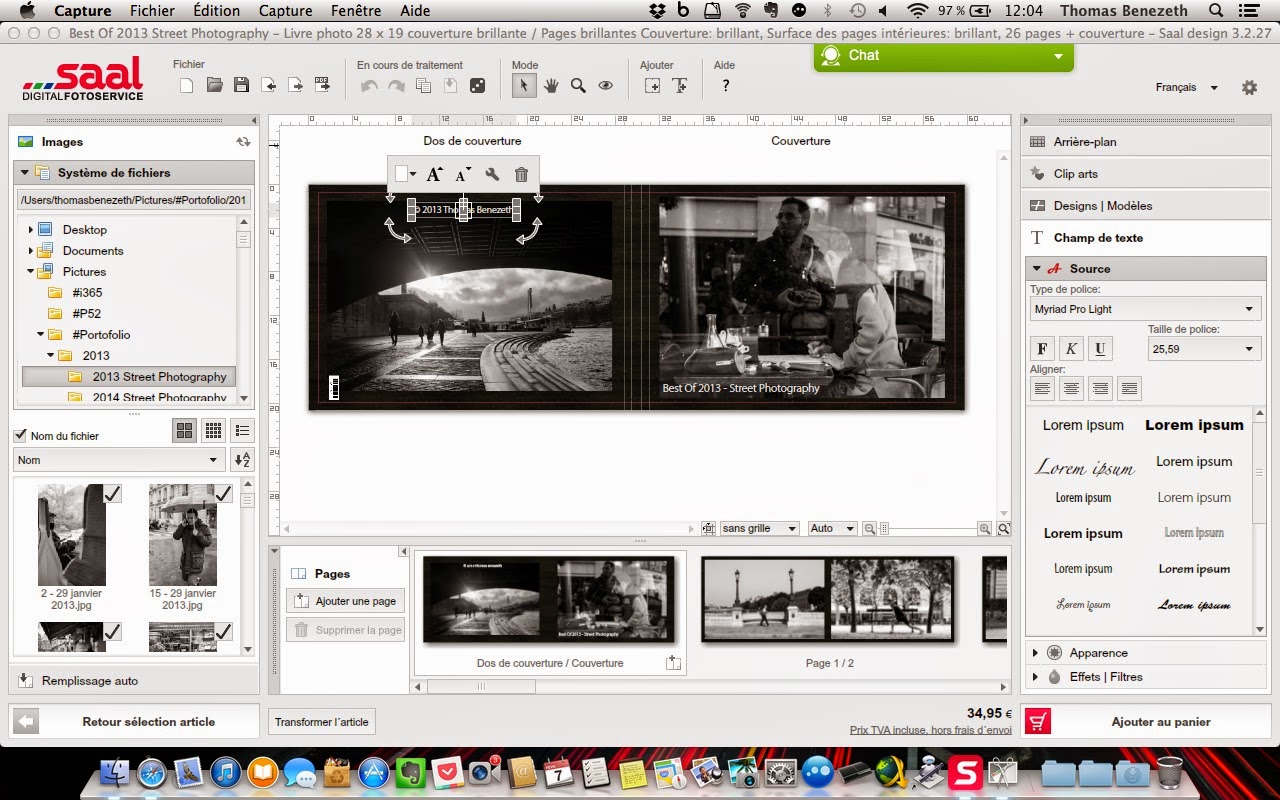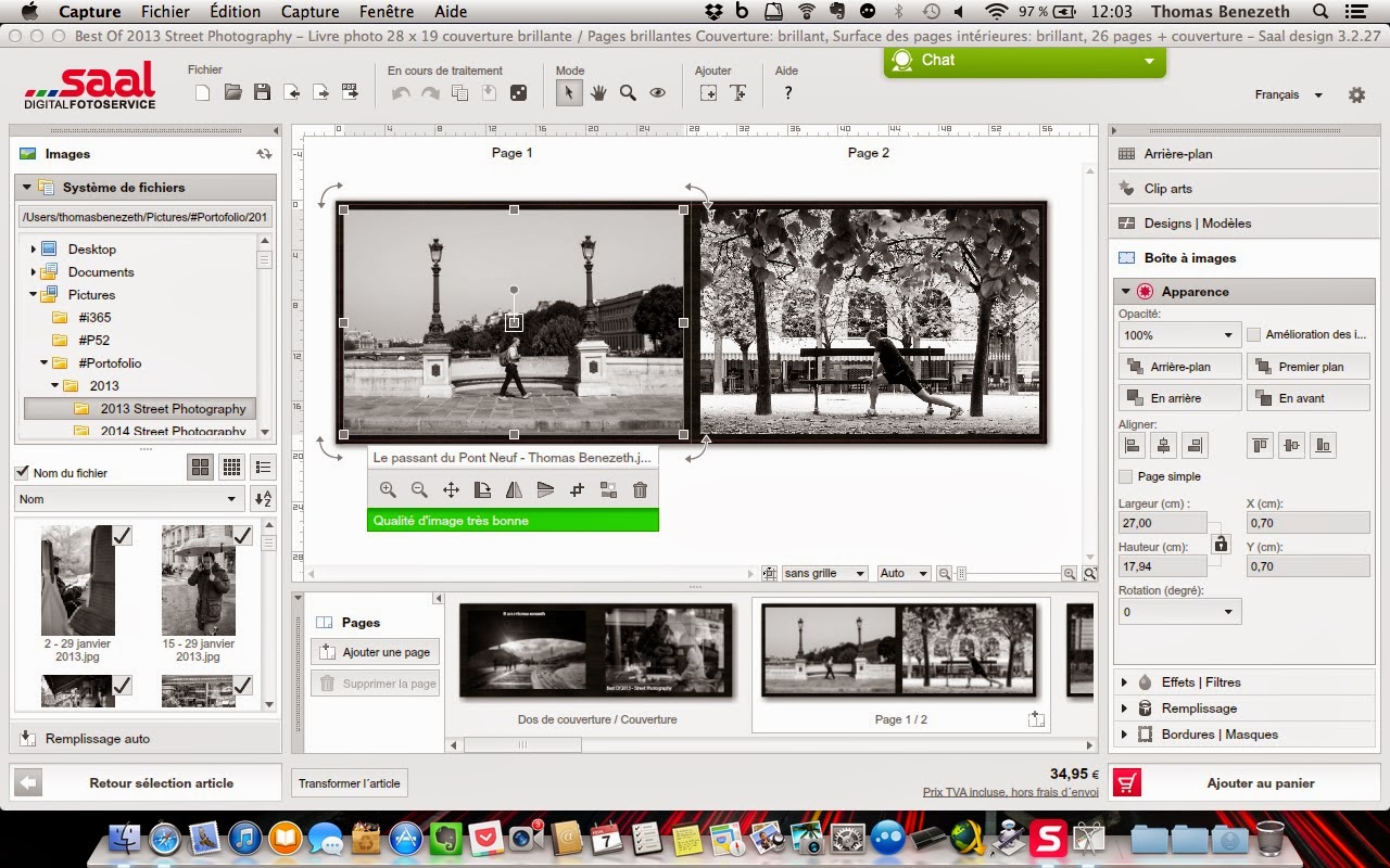 Toutes mes photos sont au format 3:2, et le format du livre (28×19) me permet de mettre mes photos au format paysage en pleine page, et de mettre deux photos au format portrait par page. Je trouve cette mise en page idéale !